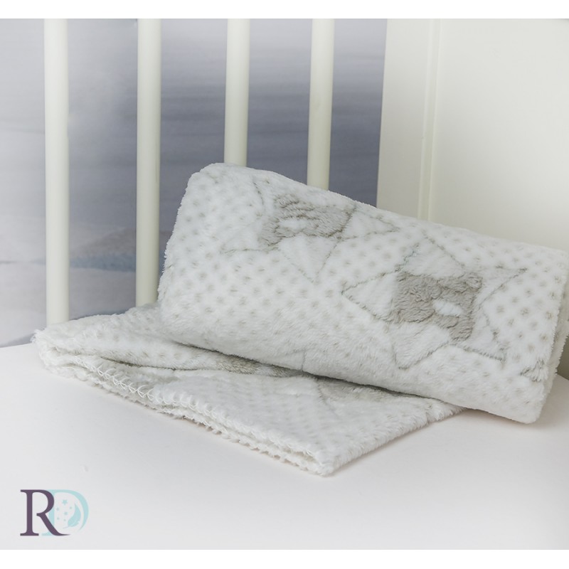 Одеялото е в бялата цветова гама, с светло бежови детайли по него.