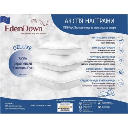 Оптимална опора и нежен допир до лицето Ви, именно този перфектно измерен баланс от 1000gr 50% висококачествен европейски патешки пух и 50% меки перца придава на тази иначе твърда възглавница усещане за сън върху облак, без да потъвате в него. Нашата Твърда Възглавница Deluxe на EdenDown е като сбъдната мечта за всеки любител на твърдите възглавници!