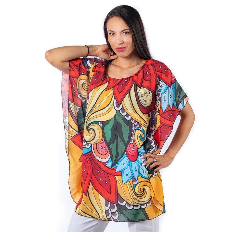 Стилен и ефирен модел, подходящ за всеки дамски силует. Моделът е атрактивен, изключително удобен. И е изработен от високо качествен шифон. Материята е лека и проветрива, но не прозира и не се разнищва. Авторският ни принт и лимитираната серия гарантират уникалност и идентичност на този модел.