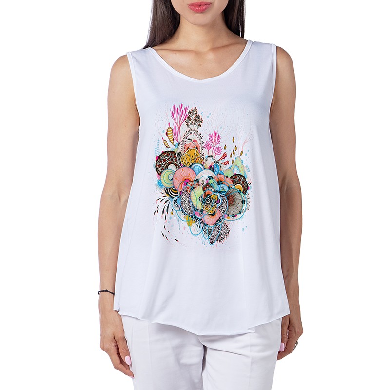 Прекрасен Дамският потник, модел e подходящ за летните горещини, с удобна и широка кройка. Широки презрамки за по вече свобода, с дигитален 3D принт предаващ индивидуалност.