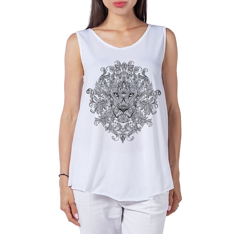 Прекрасен Дамският потник, модел e подходящ за летните горещини, с удобна и широка кройка. Широки презрамки за по вече свобода, с дигитален 3D принт предаващ индивидуалност.