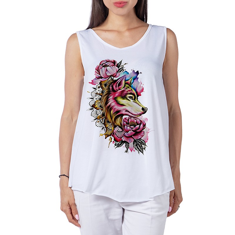 Прекрасен Дамският потник, модел e подходящ за летните горещини, с удобна и широка кройка. Широки презрамки за по вече свобода, с дигитален 3D принт предаващ индивидуалност.
