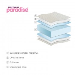 Горният слой на матрака е изработен с висококачествен текстил, капитониран с мека вата и допълнителен слой soft пяна, което добавя луксозна мекота и нежен допир. Еластичната пяна в ядрото е неподатлива на деформации и осигурява отлична проветривост, поддържайки свеж и сух микроклимат през цялата нощ. Двулицевият дизайн с изчистена визия и класически стил го прави подходящ за всяка спалня.