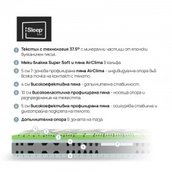 AirClima пяна за суха и свежа среда: Пяната с отворена клетъчна структура, вложена в калъфа и най-горния слой на ядрото, осигурява постоянна циркулация на въздух в матрака. Това възпрепятства задържането на влага и допълнително подпомага терморегулацията.
