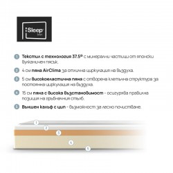 AirClima пяна за суха и свежа среда: Специалната AirClima пяна, използвана както в калъфа, така и в ядрото, е с отворена клетъчна структура. Тя осигурява бърза и ефективна циркулация на въздуха, отвеждайки влагата и предотвратявайки задържането на прах и развитието на микроорганизми.