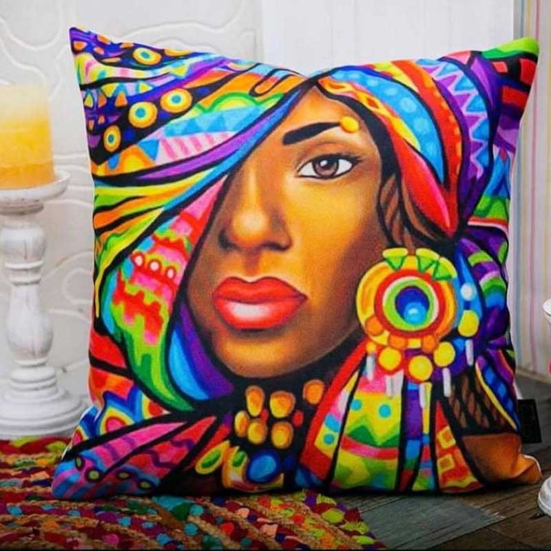 Пухкава декоративна възглавничка с цветен принт.