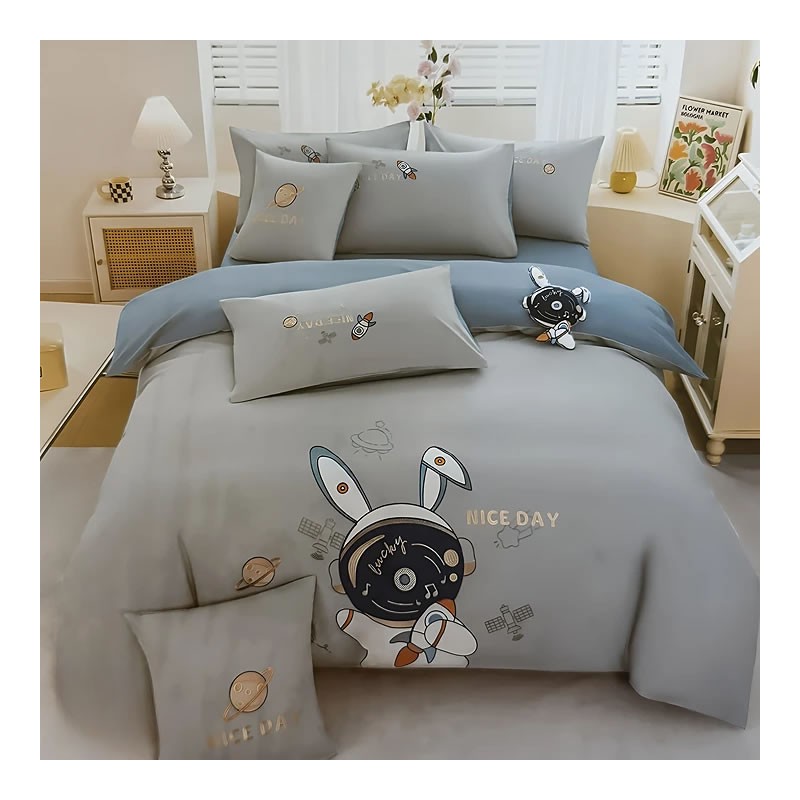 Преобразете детската стая с този детски спален комплект, който съчетава стилен дизайн и високо качество. Комплектът включва плик за одеяло или завивка, долен чаршаф и две калъфки за възглавници, изработени от луксозен памучен сатен с висок брой нишки, което го прави изключително мек, издръжлив и приятен за кожата.
