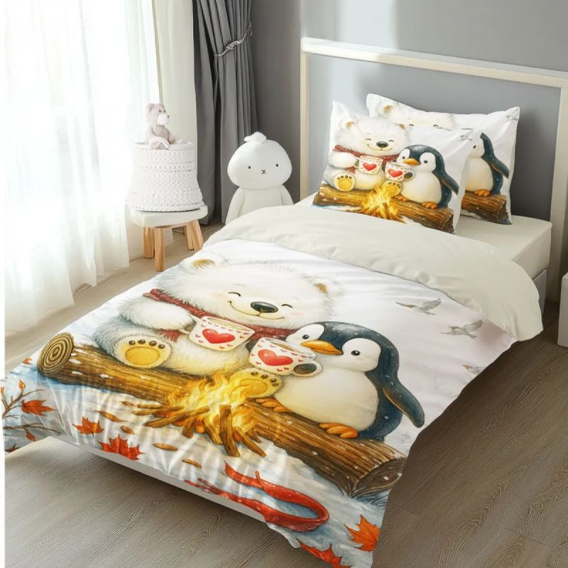 3Д Детски спален комплект, изработен в България с внимание към детайла. Съчетава здравина и мекота – чаршафът и долната страна на плика са от 100% памук Ранфорс, а лицевите части от нежна тъкан 80% памук и 20% полиестер позволяваща 3D печат.