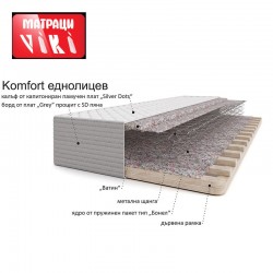 Еднолицевият матрак Комфорт е изграден върху здрава рамка от суха иглолистна дървесина. Ядрото е съставено от пружинен пакет тип Бонел, покрит с иглонабитлатексов филц и ватин. Калъфа на матрака е изграден от капитонирана памучна дамаска, под която е поставен защитен олекотен филц тип Spunbond,силиконова вата и дунапрен.