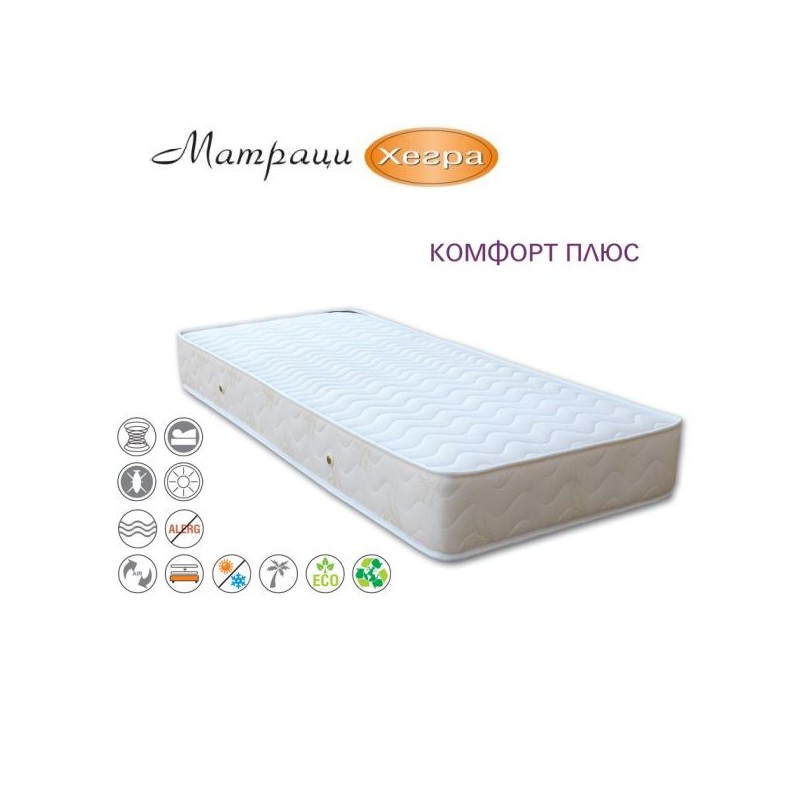 Подобреният модел ХЕГРА КОМФОРТ ПЛЮС има повишен ортопедичен и анатомичен ефект благодарение на включеният допълнителен слой кокосова вложка (естествени кокосови влакна скрепени със силиконов материал) и високоеластична пенополиуретанова пяна. Този модел притежава всичките добри качества на технологията "Бонел". Дамаската е от плат "Stretch" - трислойно трико, допирът с което е истинско удоволствие за кожата.