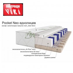 Еднолицевият матрак „Покет НЕО“ е изграден върху здрава рамка от суха иглолистна дървесина. Ядрото му е съставено от индивидуално пакетирани пружини Покет, слой от висококачествена SD25 пяна и еластична “Air fl ow” вата подпомагаща циркулацията на въздух и допринасяща за меко усещане. Калъфа на матрака е изграден от памучна дамаска “Aloe Vera”, под която е поставен защитен олекотен филц тип Spunbond и силиконова вата.