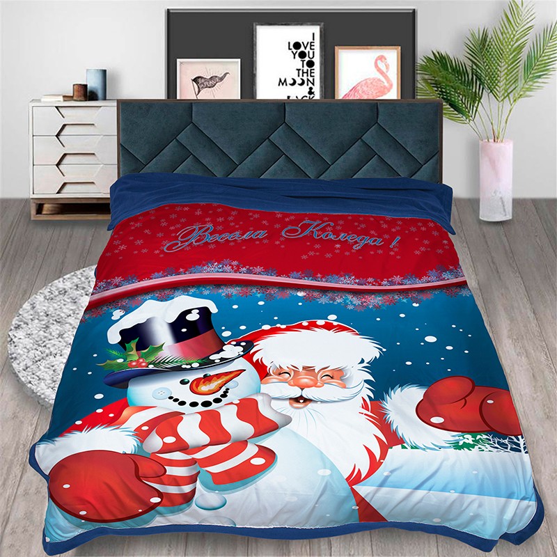 Коледно поларено одеяло с две лица от мека плюшена материя с висококачествена 3D щампа. Материята, използвана за тaзи мекa и уютна двулицева завивка , е 100% полиестер Дигиталната щампа е с наситени цветове, издържащи на многократните изпирания. Устойчивостта на материята запазва наситеността на цветовете и не губи формата си. Плътността на мик бръшът позволява използването на завивката в зимния сезон .