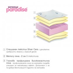 Горният слой е изработен със специален текстил, прошит с Memory пяна, която се адаптира към контурите на тялото под влияние на температурата, предлагайки индивидуално прилягане. Текстилът Silver Care е разработен с иновативна технология, интегрираща сребърни йони – те имат мощно антибактериално действие и неутрализират неприятни миризми, грижейки се за хигиената и свежестта дълго време.