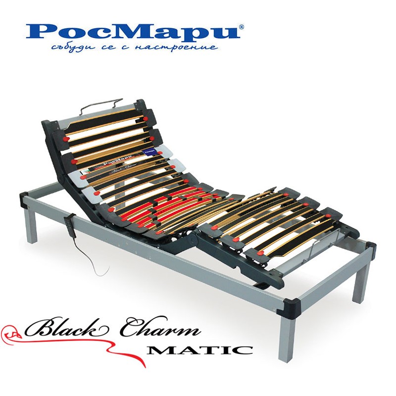 Открийте най-високите стандарти за гръбначна подкрепа и персонализиран комфорт с подматрачната рамка Блек Чарм Матик Вариант. Изработена от многослойна букова дървесина с еднопосочно ориентирани влакна, рамката гарантира изключителна устойчивост и дълготрайност, докато моторизираната конструкция с двустранно осово движение на ламелите ви дава пълен контрол над позицията на леглото.