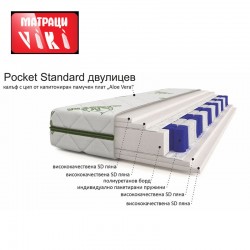 Двулицевият матрак Покет Стандарт е изграден върху ядро от Покет пружини. За максимално удобство, от всяка страна на матрака са поставени по два индивидуални слоя висококачествена SD пяна. Матрака е с полиуретанов борд и висококачествена памучна дамаска “Aloe Vera” под която е поставен защитен олекотен филц тип Spunbond и силиконова вата с цип. Това дава възможност калъфа да бъде свален и изпран при максимална температура 30°.