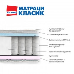 Матрак "Класик Зефир 30см" – иновативен двулицев матрак с покет пружини и високоеластични материали, създаден за оптимален комфорт и здраве на гръбнака. С 7-зонова усилена пружинна система (Pocket Spring Units), матракът предлага равномерно разпределение на теглото и стабилна опора, подходяща за хора с активен начин на живот или болки в ставите