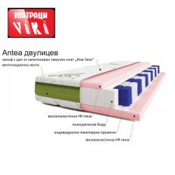 Ядрото на двулицевия матрак Антеа е от индивидуално пакетирани пружини Покет и слой висококачествена HR пяна от двете страни. Калъфа на матрака е изграден от памучна дамаска Aloe Vera, под която е поставен защитен олекотен филц тип Spunbond, силиконова вата, дунапрен и дишаща 3D лента, подпомагаща циркулацията на въздуха.