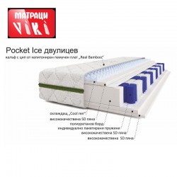 Двулицевият матрак “Покет АЙС” е изграден върху ядро от Покет пружини. За максимално удобство, от едната страна на матрака са поставени два индивидуални слоя висококачествена SD пяна, а от другата е разположен слой от висококачествена SD пяна съчетан с профилиран охлаждащ мемори гел, създаващи възможност за избор между твърда и мека страна. Матрака е с полиуретанов борд и висококачествена памучна дамаска “Real Bamboo” под която е поставен защитен олекотен филц тип Spunbond и силиконова вата с цип. Това дава възможност калъфа да бъде свален и изпран при максимална температура 30°.