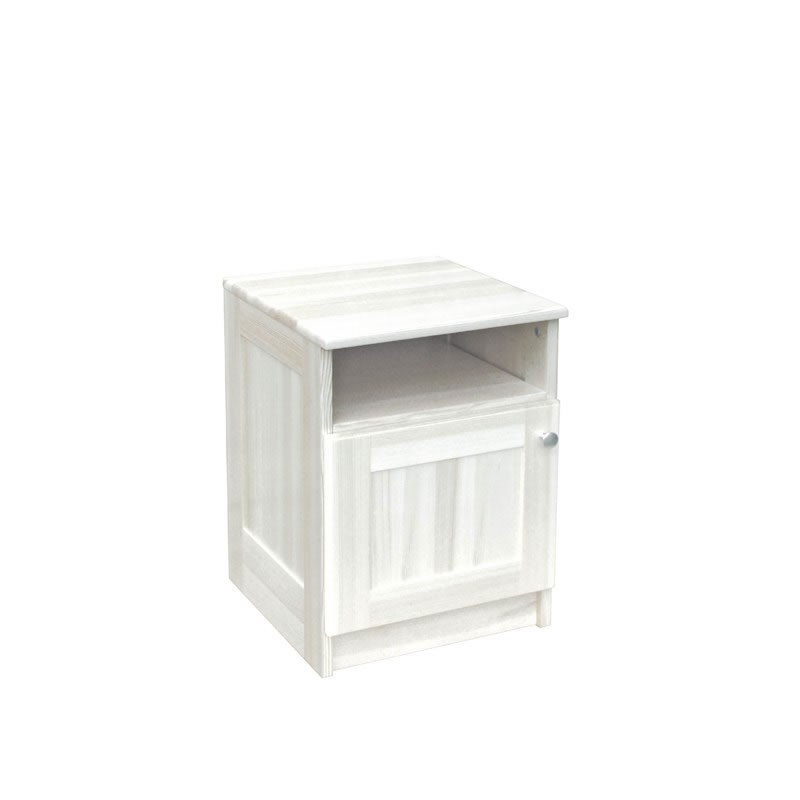 Елегантно нощно шкафче, което ще се впише перфектно във вашата спалня. Изработено е от първокачествен масив от иглолистна дървесина и е покрито с дебел слой лак от двете страни, което гарантира неговата устойчивост и дълъг живот. Шкафчето разполага с удобен рафт и затваряща се вратичка. Доставя се в сглобяем вид. Цвят: бял. Размери: 35 см ширина, 35 см дълбочина и 51 см височина.