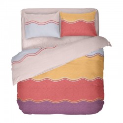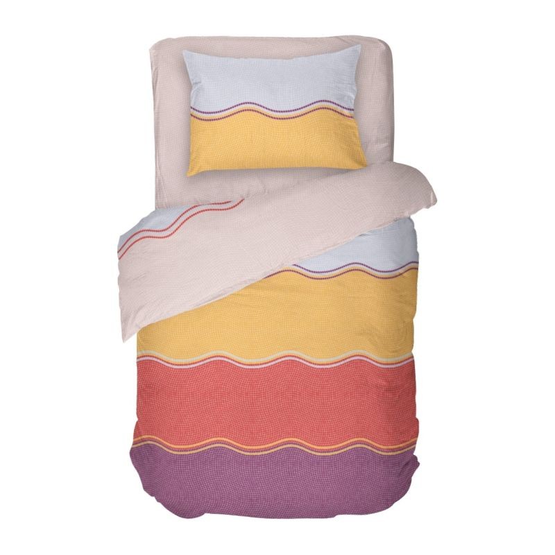 Спалното бельо е на райета в тъмни нюанси и допълва всеки спален интериор. Спалният плик се затваря с копчета. Десенът на долния чаршаф е илюстриран на калъфките.