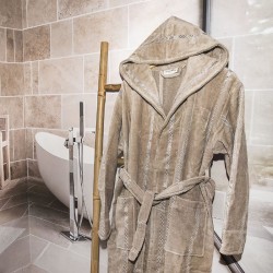 Изживейте лукса с мъжкия халат Моника - вашата ежедневна доза мекота и комфорт след баня. Изработен от 100% висококачествен памук с грамаж 400 гр/кв.м., той гарантира отлична попиваемост и нежно докосване до кожата. Предлага се в елегантна опаковка, идеална за подарък.