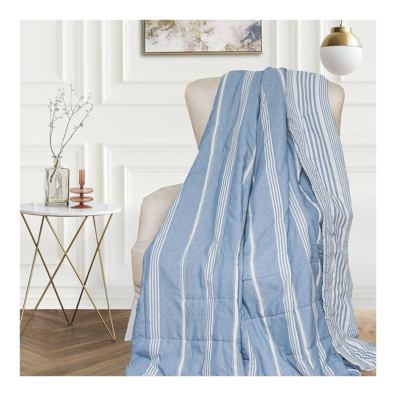 Тази кувертюра е в нежни ивици (райе) и е изработена от мека памучна материя (100% памук), която осигурява комфорт и стил.