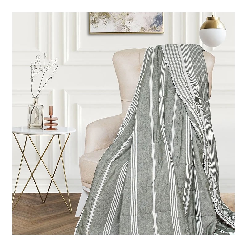 Тази кувертюра е в нежни ивици (райе) и е изработена от мека памучна материя (100% памук), която осигурява комфорт и стил.