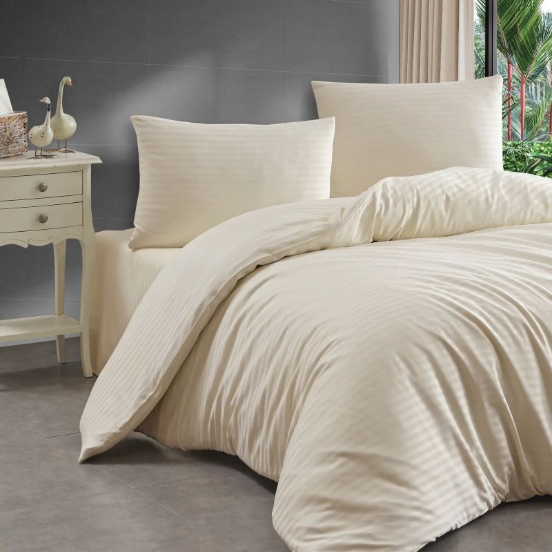 Едноцветен спален комплект от памучен сатен в нежни тонове създава топла и уютна обстановка. Изработен от висококачествен памучен сатен с по-висок брой нишки, този комплект предлага изключителна здравина. Плътното тъкане осигурява дълготрайна устойчивост на износване. Подобрете качеството на съня и естетиката на спалнята си с този луксозен комплект. Деликатните пастелни нюанси създават успокояваща атмосфера, която насърчава релаксацията и спокойствието, а богатата сатенена тъкан добавя нотка лукс към вашето лично пространство.